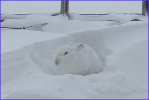 2枚目には、エゾユキウサギに寄った写真が投稿されていました。 雪壁を利用して寒さに耐える姿から、自然界の厳しさがひしひしと伝わってきます。