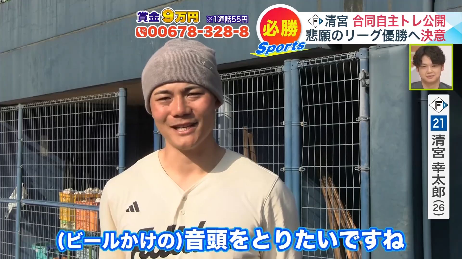 清宮選手は柳田選手のことを「太陽みたいな存在。エネルギッシュですし、いろんな人を惹きつける魅力がある人」と敬意を示しつつ、「ここでは一緒に取り組んでいますが、シーズンが始まればもちろんライバルですし、今年こそは僕らが絶対に勝つと思っているので、(ビールかけの)音頭は取りたいですね」と語りました。