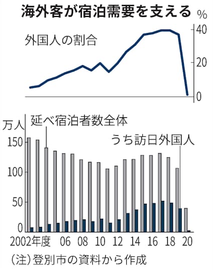 登別市で2002年度に158万人を数えた延べ宿泊者数は11年度に106万人まで落ち込んだものの、新型コロナ前の17年度に131万人まで持ち直しました。