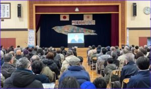 民話ゆかりの地であるオタモイ海岸からほど近い塩谷小学校で上映会を実施。吹雪という厳しい天候の中にもかかわらず、定員80名を大幅に上回る約140名の住民や子どもたちが参加しました。