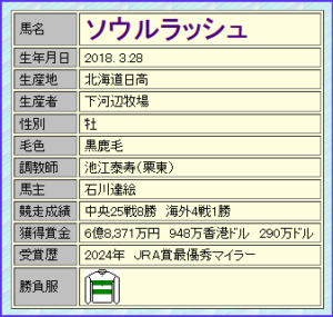 24年マイルCS、25年ドバイターフを制したソウルラッシュ(牡8、栗東・池江泰寿宿舎)が8日、JRAの競走馬登録を抹消された。今後は北海道日高町のブリーダーズ・スタリオン・ステーションで種牡馬になることについて、JRAが同日、ホームページで発表した。